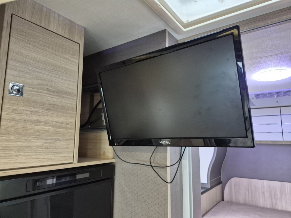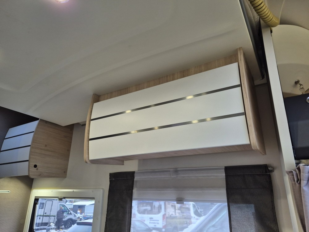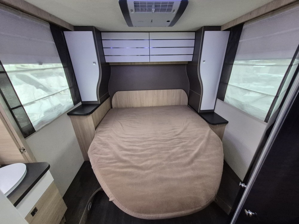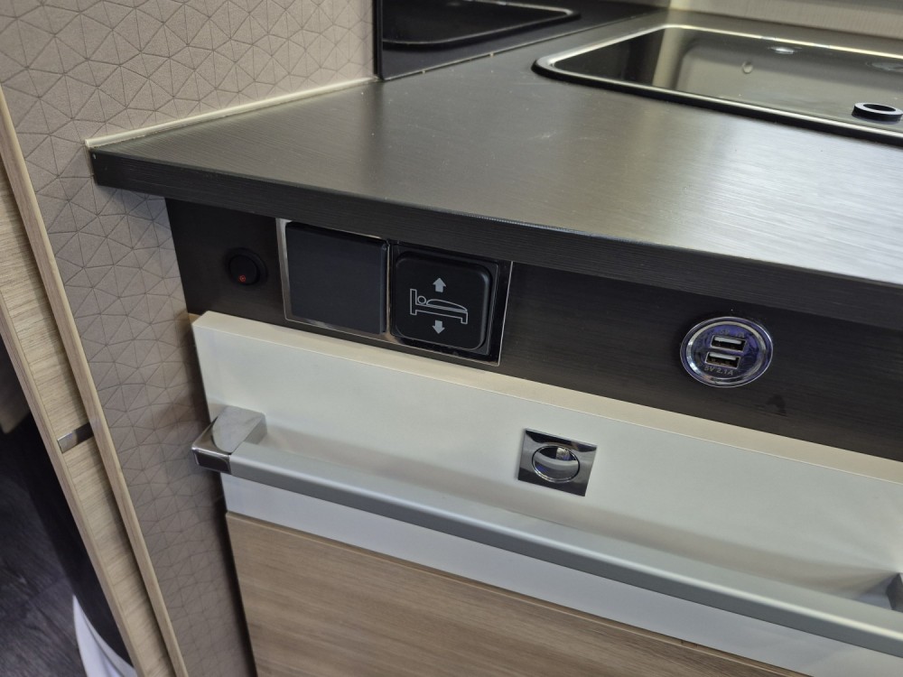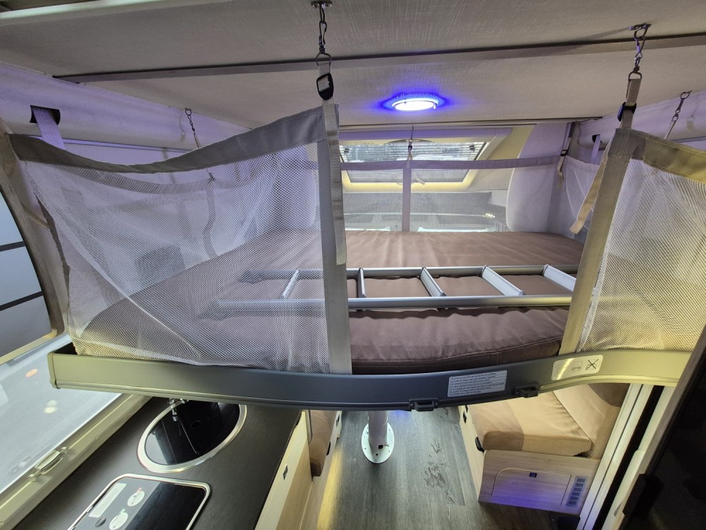 - Elektrycznie opuszczane łóżko 2-osobowe podwieszane w zabudowie 140 x 190 cm (w czasie złożenia "przylega" do sufitu i pozwala na użytkowanie całej przestrzeni kampera), max nośność 250 kg