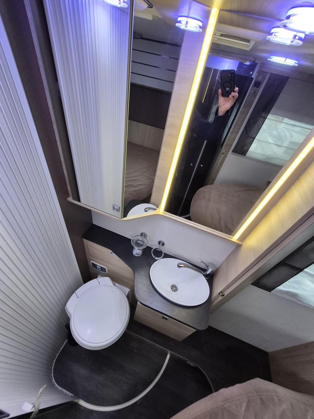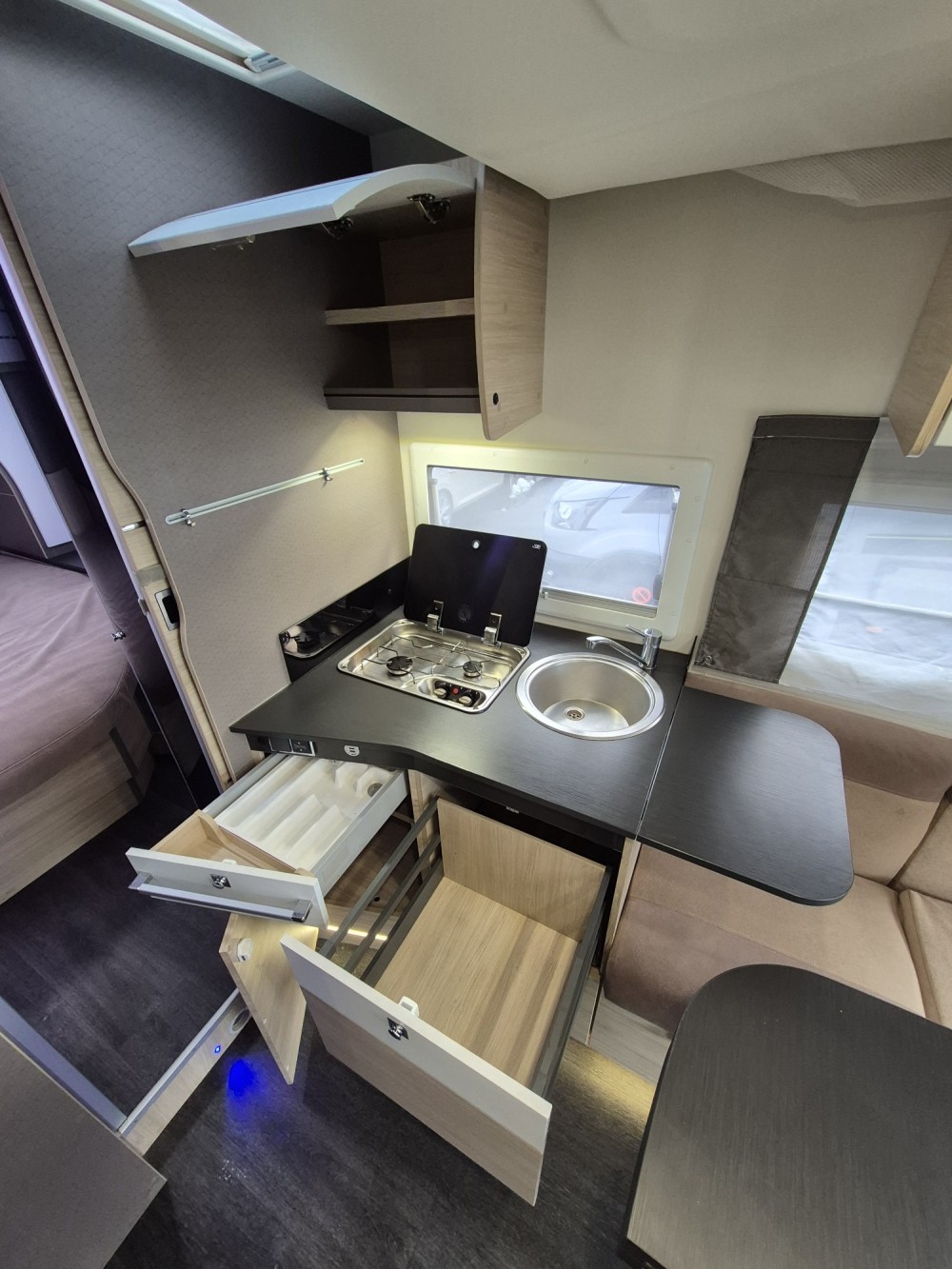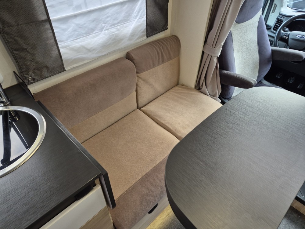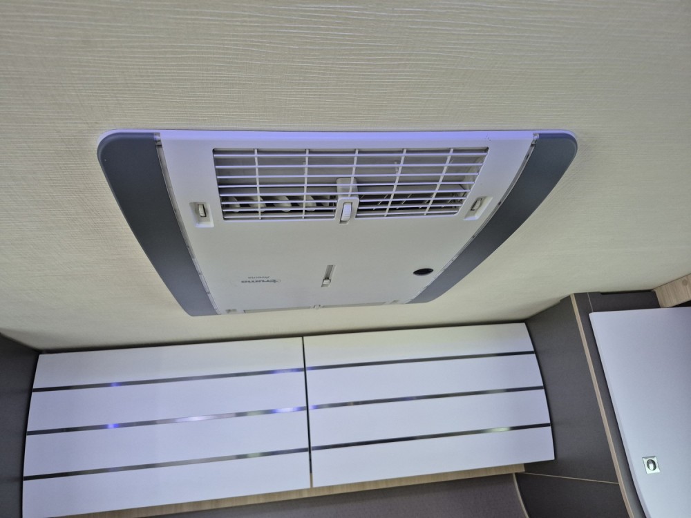 - Elektrycznie opuszczane łóżko 2-osobowe podwieszane w zabudowie 140 x 190 cm (w czasie złożenia "przylega" do sufitu i pozwala na użytkowanie całej przestrzeni kampera), max nośność 250 kg