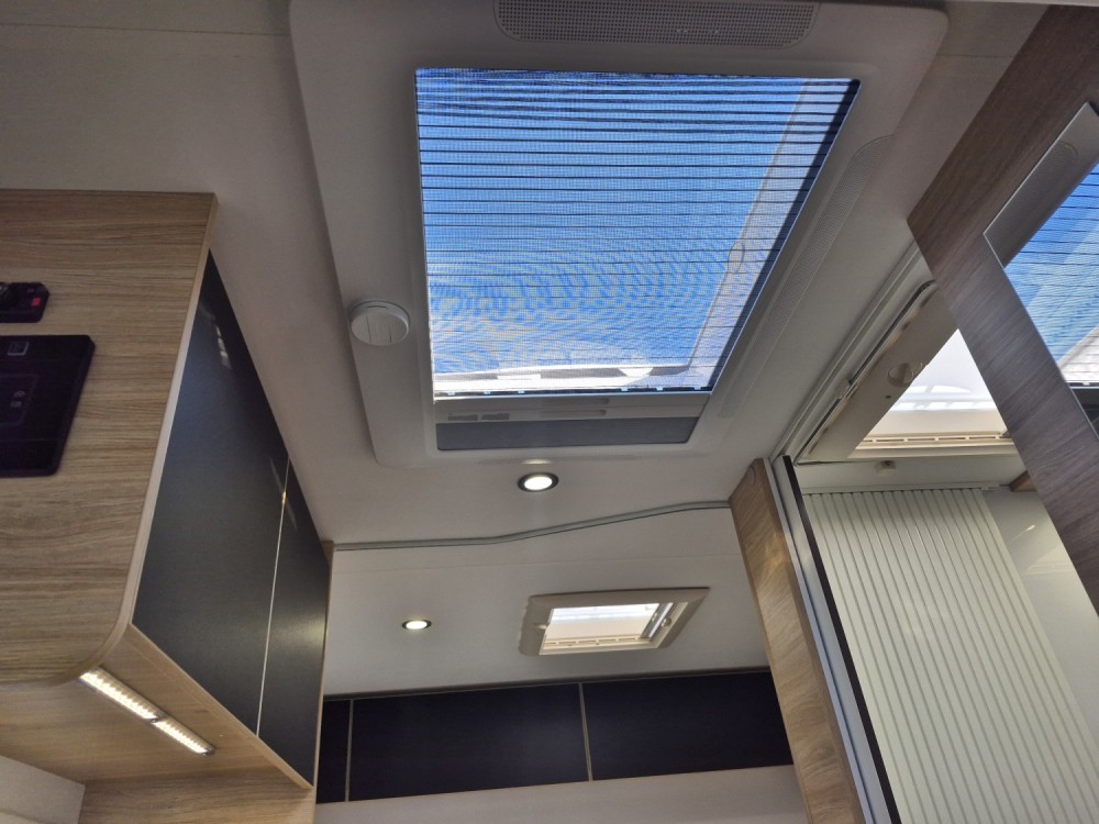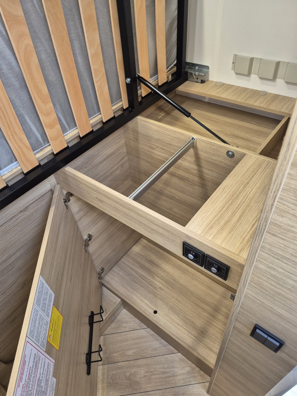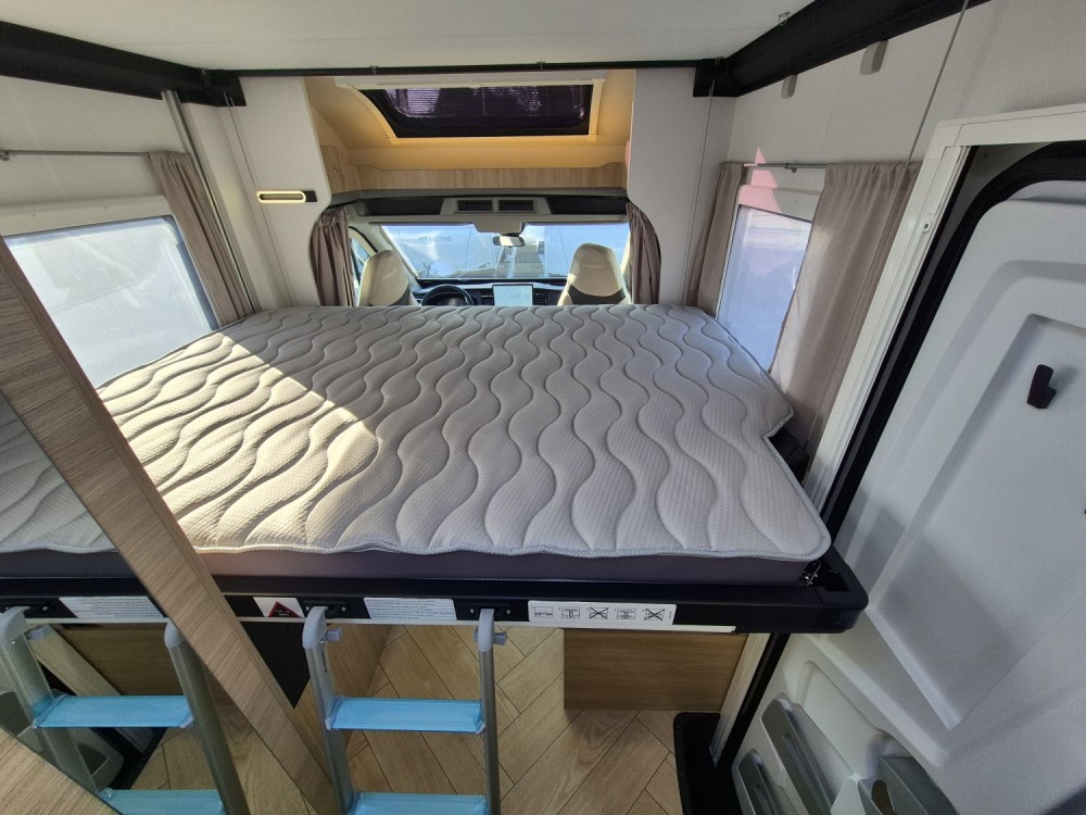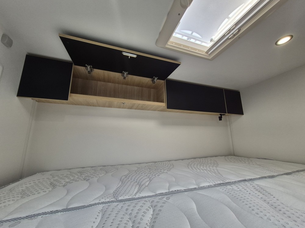 - Elektrycznie opuszczane łóżko 2-osobowe podwieszane w zabudowie 140 x 190 cm (w czasie złożenia "przylega" do sufitu i pozwala na użytkowanie całej przestrzeni kampera)