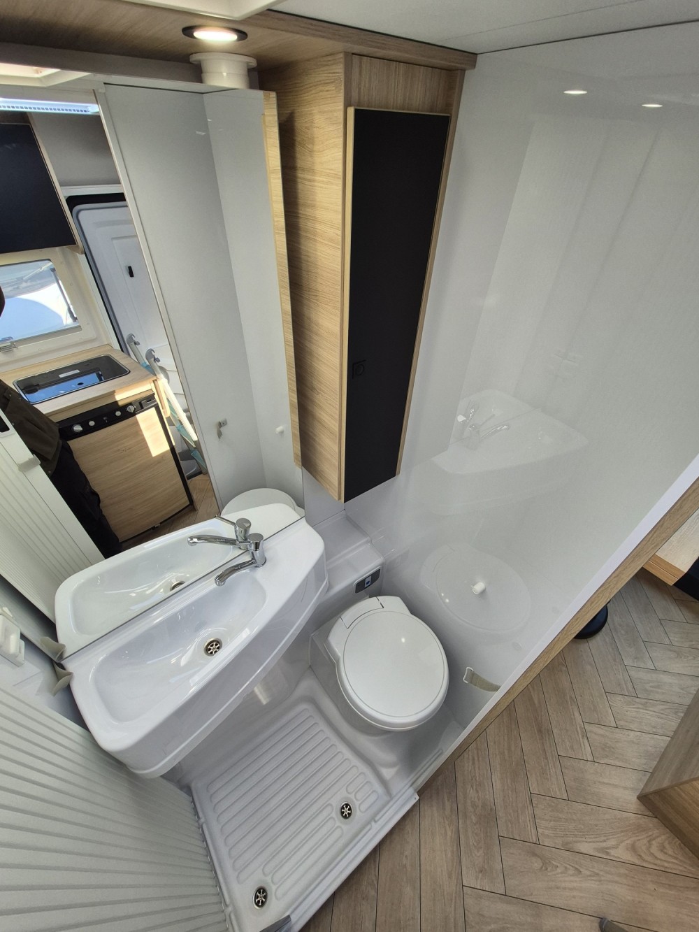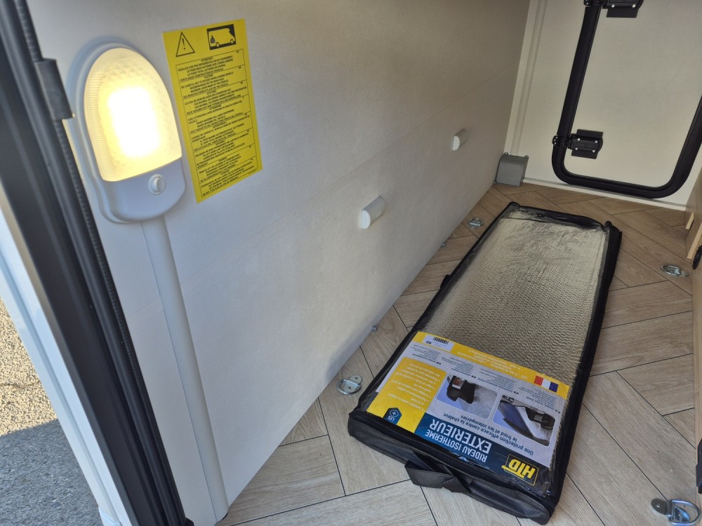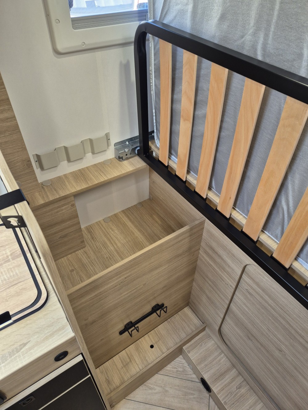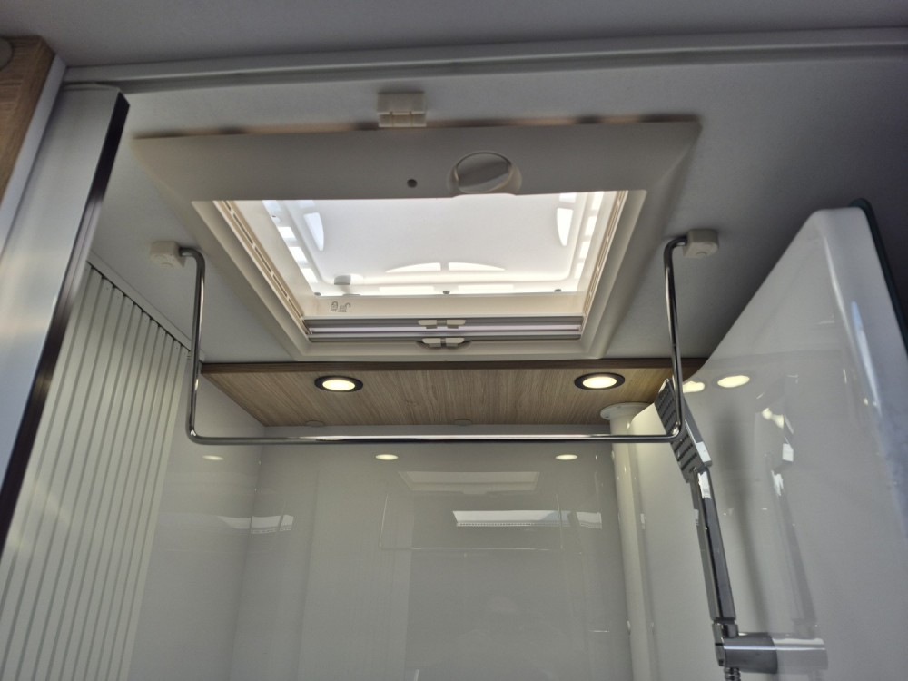 - Elektrycznie opuszczane łóżko 2-osobowe podwieszane w zabudowie 140 x 190 cm (w czasie złożenia "przylega" do sufitu i pozwala na użytkowanie całej przestrzeni kampera)