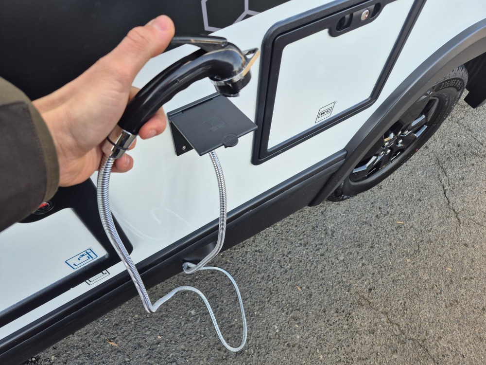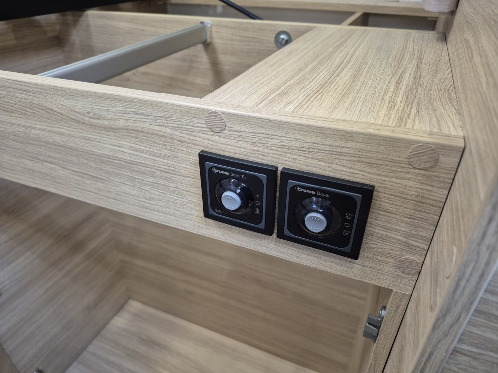 - TECHNIBOX - zabudowa wyposażona w boczną klapę serwisową gdzie znajdują się wszystkie najważniejsze elementy obsługi - skrzynka z bezpiecznikami, zawory spustowe, wlew czystej wody.