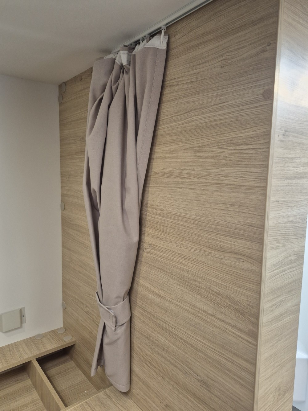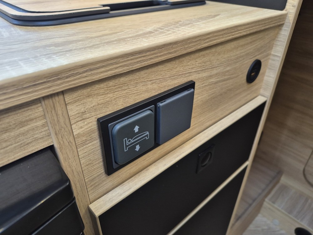 - Elektrycznie opuszczane łóżko 2-osobowe podwieszane w zabudowie 140 x 190 cm (w czasie złożenia "przylega" do sufitu i pozwala na użytkowanie całej przestrzeni kampera)
