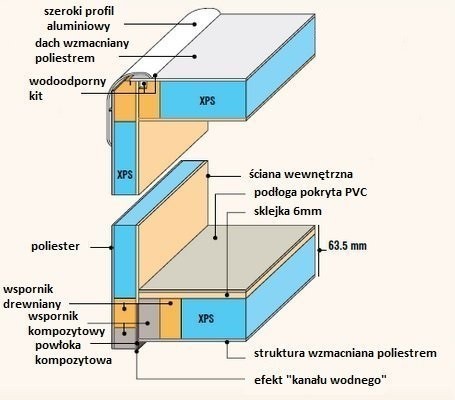 - Nadwozie wykonane z polyestru (dach oraz boczne ściany). System GRP/GFK - użycie żywicy z włóknem szklanym zapewnia większą odporność na gradobicie (w porównaniu do blachy aluminiowej). Technologia tego typu umożliwia również łatwiejsze naprawienie poszycia w wyniku wszelkiego rodzaju uszkodzeń.